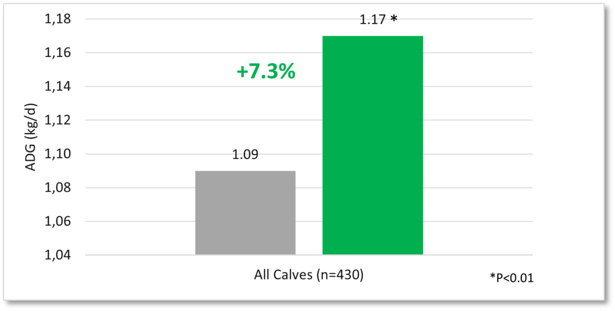 For calves with the same birth weight in both the control group and the LEVUCELL SC group, we observed a 7% increase in ADG (Figure 2) and a 5% increase in weaning weights. This improvement is attributed to the higher milk performance of the cows fed LEVUCELL SC. Based on the Kansas calf price in 2023, this translates to an extra $72 per calf and a return on investment of 7.5:1.