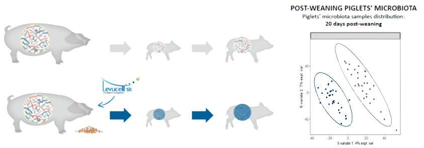 Le Floch et al. showed that sows supplemented with LEVUCELL SB will have a different microbiota profile than non-supplemented sows. Piglets born from sows supplemented with LEVUCELL SB will also exhibit different microbiota profiles. Another study, conducted by Achard et al., in 2019, showed that this maternal microbial imprinting has a long-lasting effect in piglets, that can still be visible 20 days after weaning (Figure 1).