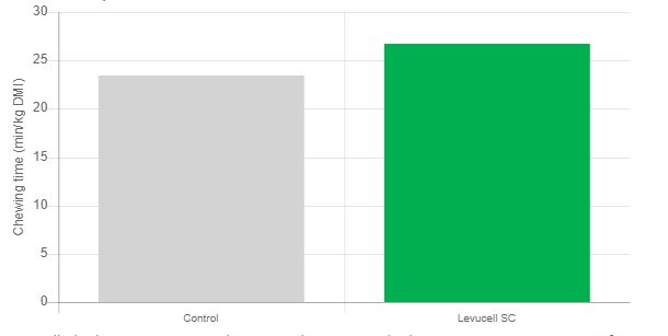 Chewing and ruminating can contribute to increased saliva production, hence the higher buffer effect, as translated into improved rumen pH (+0.34 pH units on average with the live yeast) and reduced risks of SARA (Figure 2).