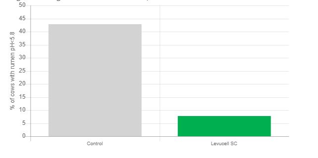 Effect of live yeast supplementation on the percentage of dairy cows with rumen pH below 5.8 (SARA risk) (P<0.05) (adapted from Perdomo et al., 2020, results of one supplementation regimen among two different doses tested)