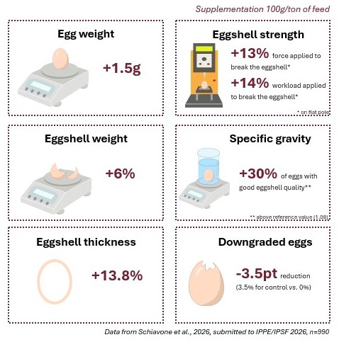 - 1 Schiavone, A., et al. Impact of Pediococcus acidilactici CNCM I-4622 Supplementation on Egg and Eggshell Quality Across the Laying Cycle: A Multi- Trial Approach. WPC, 2026.