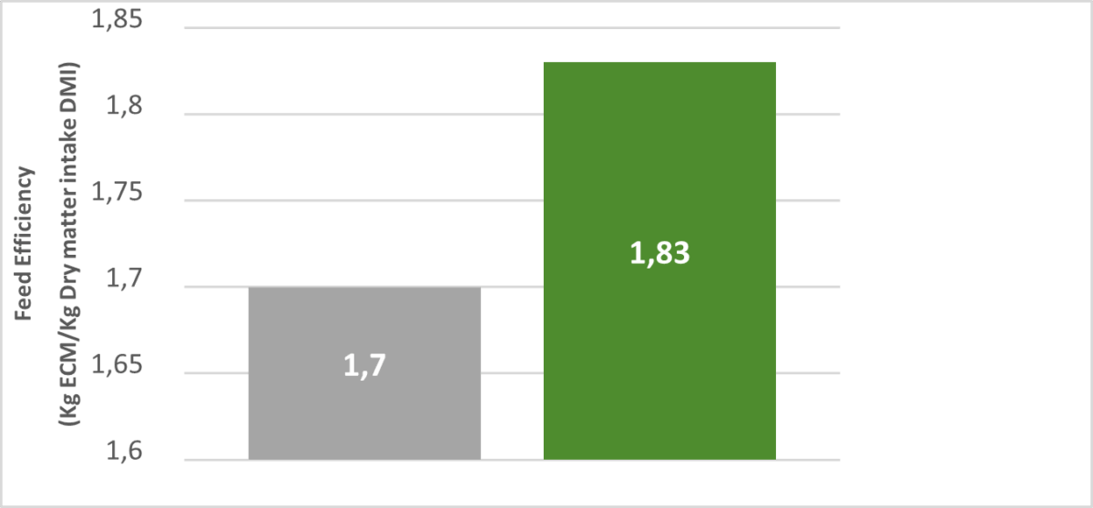 The performance evaluation (Figure 1) showed a 7.6% improvement in feed efficiency (+130g of milk/kg DMI) without nutrient dilution. The same dataset has now been used to conduct a Life Cycle Assessment (LCA) of milk production with and without LEVUCELL SC.