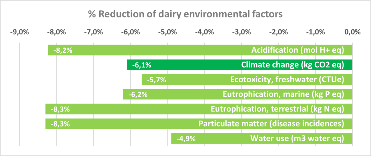 Moreover, across the seven environmental indicators selected by PEFCR Dairy as key all showed reductions (from 4.9% to 8.3%, Figure 3). These reductions stem primarily from higher feed efficiency and improved milk yield, as fewer resources and emissions were needed per unit of output.