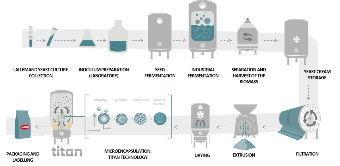 Producing quality yeast requires skills and expertise, the Lallemand group has mastered the art of fermentation during its 100+ years of experience in yeast and bacteria production across a broad range of markets. As a primary producer of microorganisms, the company has a full control over the production process from the lab to packaging. Moreover, strict quality control is implemented at every stage from the cell bank that is used to start production to the logistics platform. This ensures the quality, safety and consistency of our TITAN protected live yeast for all customers and end-users.