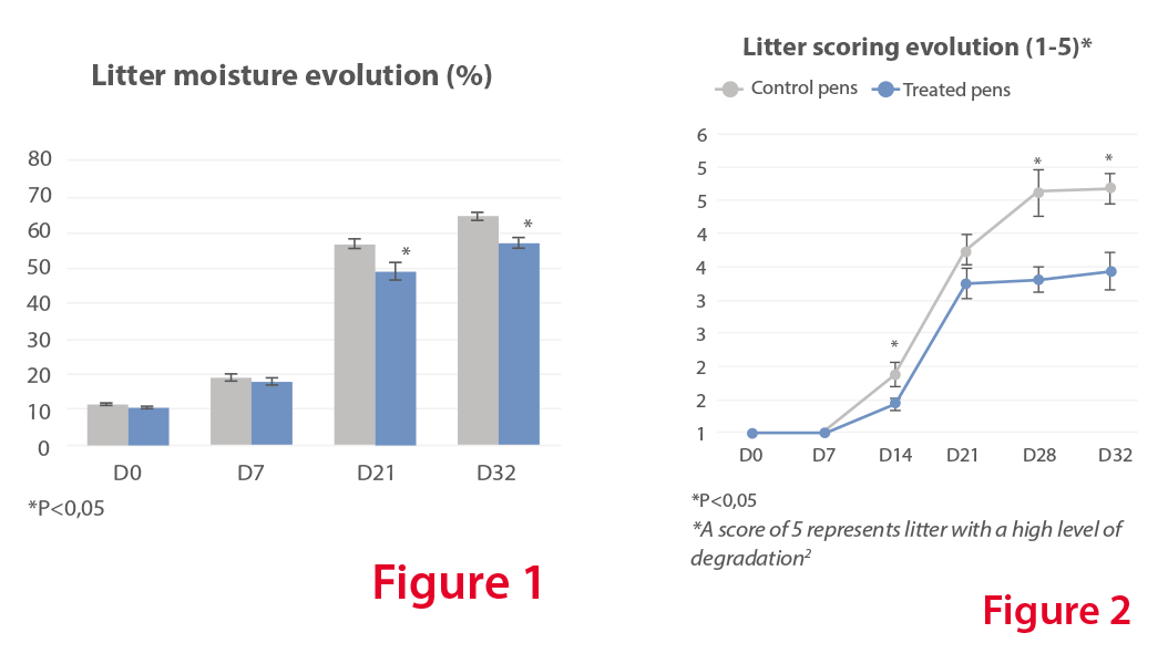 During the cycle, the litter moisture increased for both groups as expected due to the accumulation of feces and urine However, from D21 and up to D32, the moisture level was significantly lower in the pens having received the bacterial litter conditioner compared to the control pens (Figure 1).