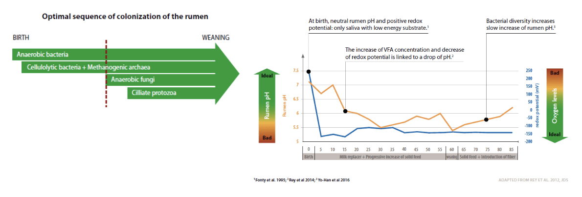 Colonization follows a very precise sequence, linked to the evolution of the rumen environment. At birth, the digestive tract is considered sterile. However, microbial establishment occurs immediately after birth, by inoculation through the dam vaginal canal, feces, and saliva. Rapid bacterial growth occurs even in the absence of a fermentable substrate. The first bacteria to settle change the environment by consuming desquamated rumen epithelial cells and oxygen, thus lowering the pH through VFA production. Then, ecological conditions are more suitable for colonization by strict anaerobes, which occurs progressively, with fiber-degrading bacteria, methanogenic Archaea, cellulolytic fungi, and finally, ciliate protozoa. Rumen maturity is considered as fully achieved when ciliate protozoa are established, at around two months of age.