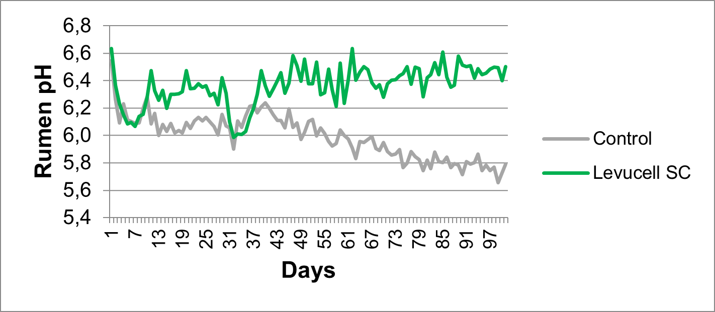 S. cerevisiae CNCM I-1077, LEVUCELL SC, helps stabilize the rumen pH, especially when the animal is under heat stress conditions.