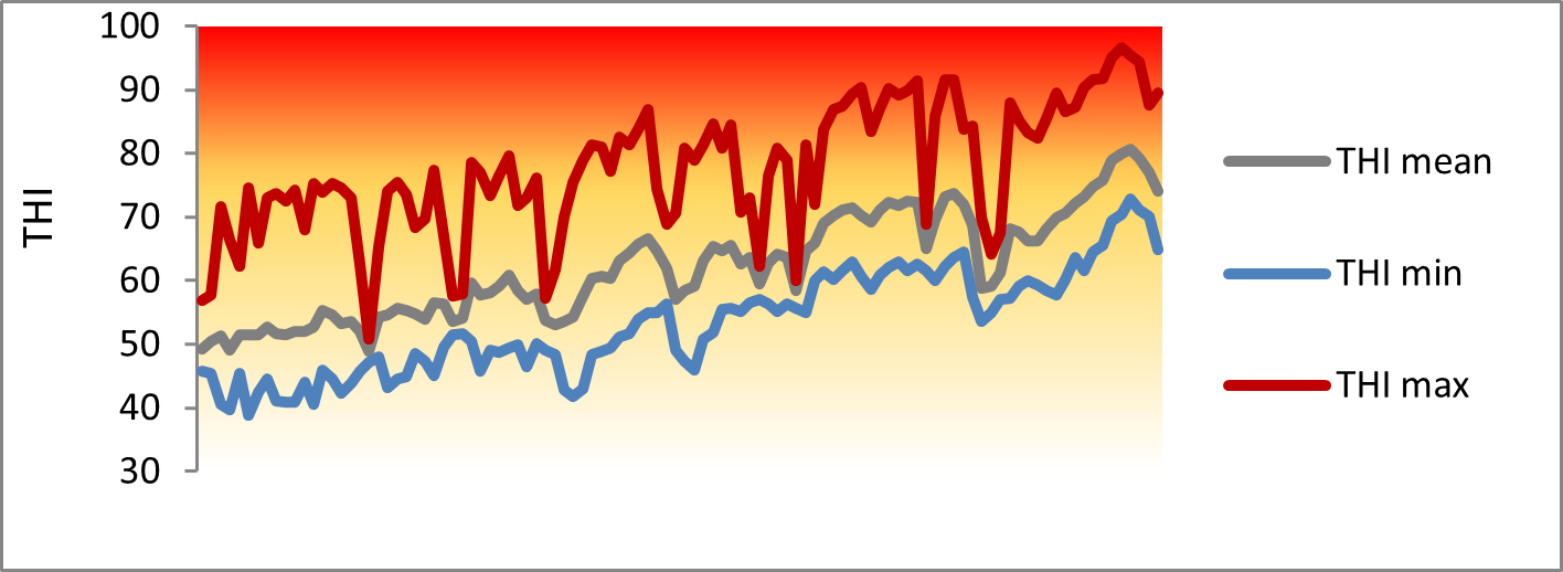 Researchers from France (Morignat et al., 2015) show that elevated temperatures (every 1° above the thermoneutral zone) increase the risk of mortality between 4.4 and 5.6%. These results were confirmed by other authors. Studies with dairy cattle show that herd size, breed, and age have no effect on THI-related mortality (Crescio et al., 2010).