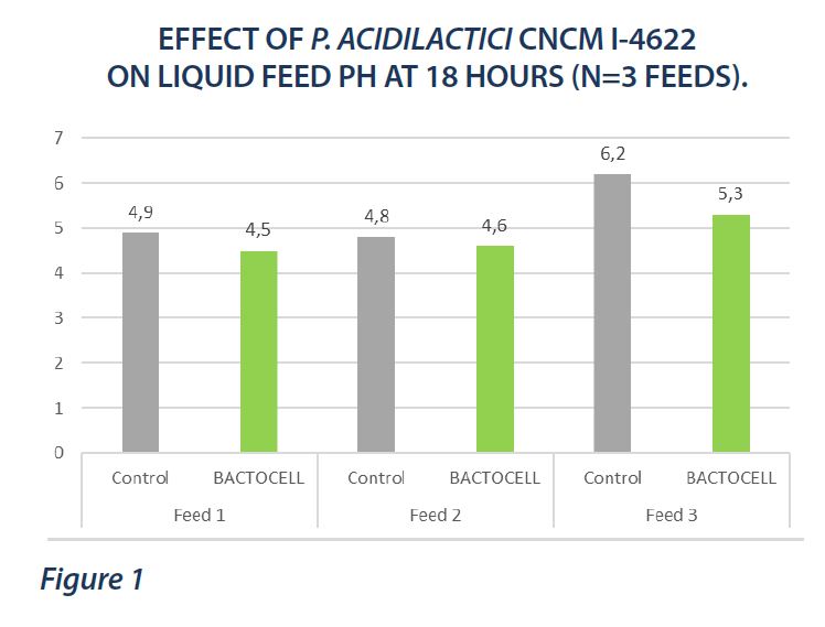 After 10 hours incubation at 30°C, the feeds containing P. acidilactici CNCM I-4622 were better and faster acidified than control feed. Feed pH was significantly lower (Figure 1). Similarly, the concentration of L-lactic acid in the feed was significantly higher with the lactic acid bacteria.