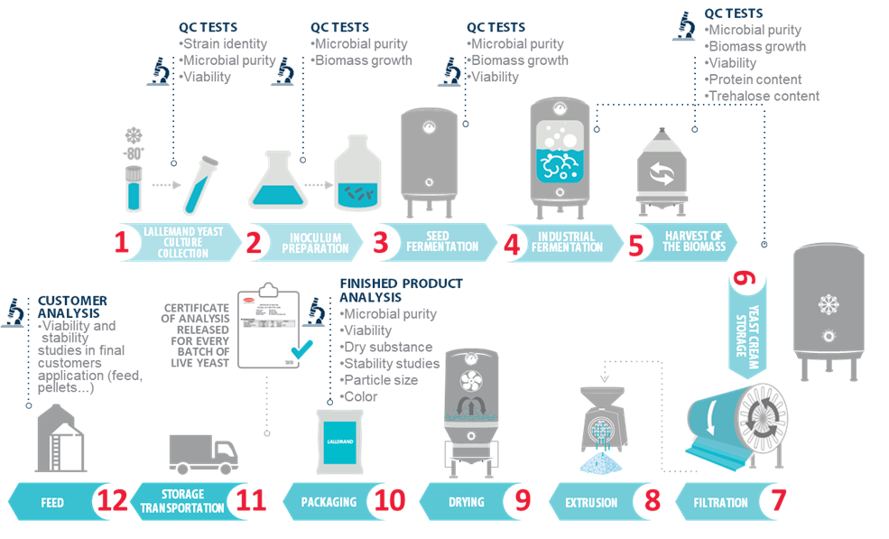 Throughout the whole process, about 20 quality tests are performed, ensuring purity, viability and identity of the yeast strain in the final product, as well as batch-to-batch consistency (Figure 1). A certificate of analysis is released for every batch of live yeast produced by Lallemand.
