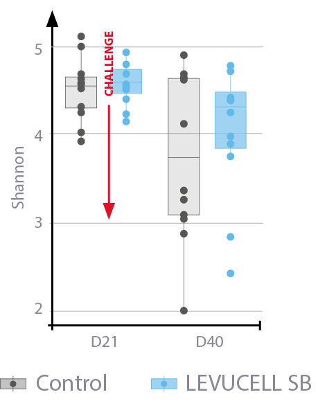 - With the live yeast supplement, the microbiota shows a better resilience to the challenge. On day 40, the live yeast samples count a higher number of different species with less predominance of certain species (Figure 1).