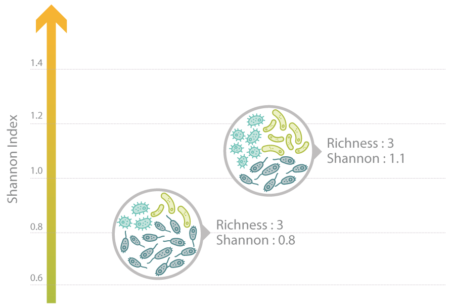 - Alpha-diversity represents the diversity within one microbiota sample. Shannon index is one of the most used criteria to describe alpha-diversity. It considers both the total number of different taxa found in the sample, called the richness and the abundance or predominance of some taxa among the sample. The highest the Shannon Index, the more diverse and rich the microbiota.