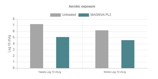 Trials show that after 30 days ensiling and five days after opening, MAGNIVA Platinum reduces yeast and mold levels by over 100 times compared to untreated grass silage (Figure 1).