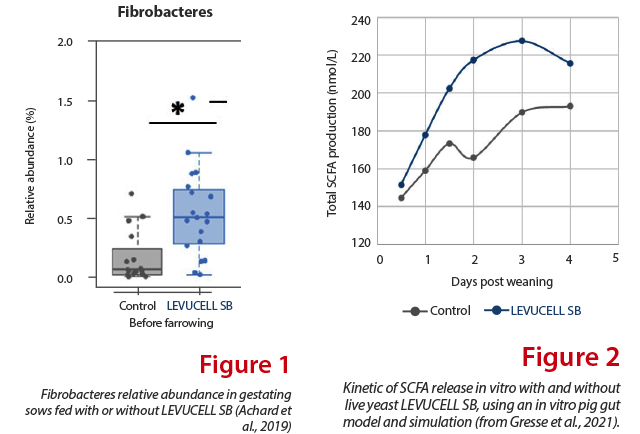 Part of the mode of action of S. c. boulardii CNCM I-1079 (LEVUCELL SB) in the gut of sows has to do with the fast consumption of oxygen carried out by the yeast in the hindgut. This creates better anaerobic conditions where the cellulolytic bacteria can proliferate, leading to an improved fermentation rate. This effect on the fiber-degrading microbiota population, already shown in sows and post-weaning piglets (Figure 1) is confirmed when investigating the microbial short-chain fatty acids (SCFA) production with an in vitro colonic model (Figure 2). As a result, more energy is expected to be released from the same diet.