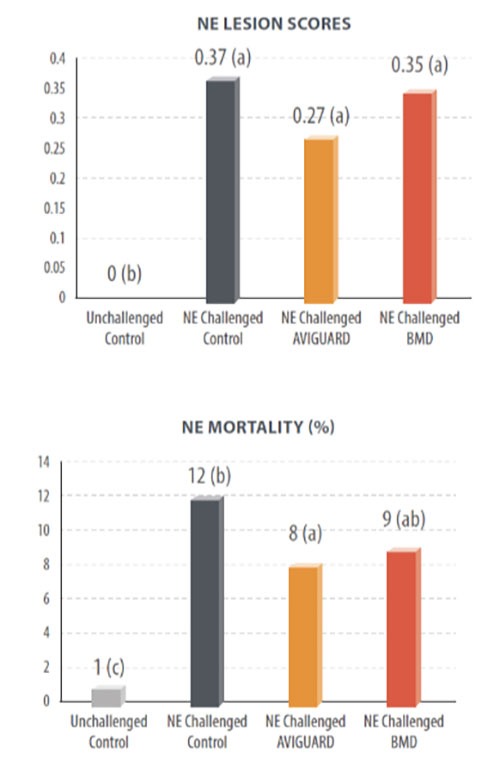 After 42 days, NE lesion scores were the lowest with AVIGUARD, and NE mortality was significantly lower in the AVIGUARD group (Figure 1) as compared to control and antibiotic group. It was concluded that the CE solution, applied only once to the chicks, performed equal to, or better than, the antibiotic, which was fed continuously to the chicks.