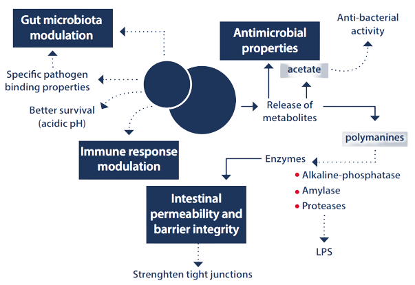 It has been proven that Saccharomyces cerevisiae var. boulardii produces specific metabolites of great interest towards undesirable bacteria and their toxins, as well as supports the host’s immune response. For instance: