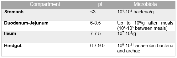 - Microbial diversity increases along the gastrointestinal tract. Different parts of the gut have specific roles in nutrient digestion, and they host very specific microbial communities adapted to their micro-environment. For instance, major fermentation processes take place in the hindgut with a large population of bacteria species (Table 1).