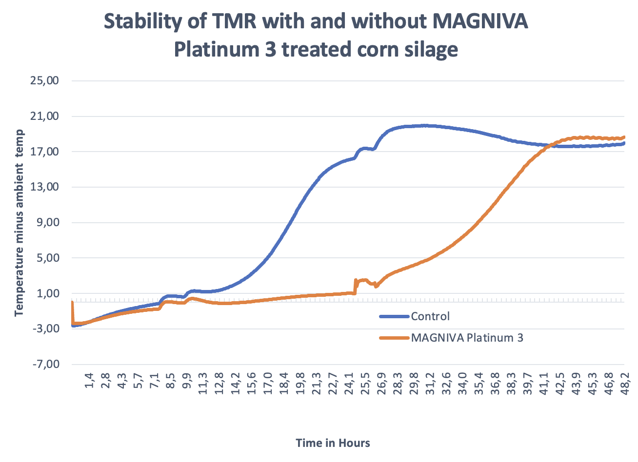 Story based on a new trial carried out at the Forage Centre of Excellence, in Miner, N.Y., in 2023. MAGNIVA Platinum 3-treated corn silage stabilised TMR heating compared to untreated corn silage. Cooler, more stable TMR results in better dry matter intake and milk production.