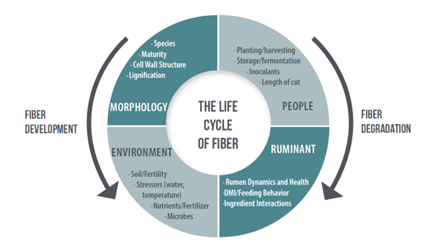 This is a concept that examines both the development and degradation of fiber from the soil to the plant to the silo to the cow. The development of fiber is influenced by the environment in which the plant is grown and the inherent morphological differences between plant species. The degradation of fiber is influenced by farming practices and rumen dynamics.