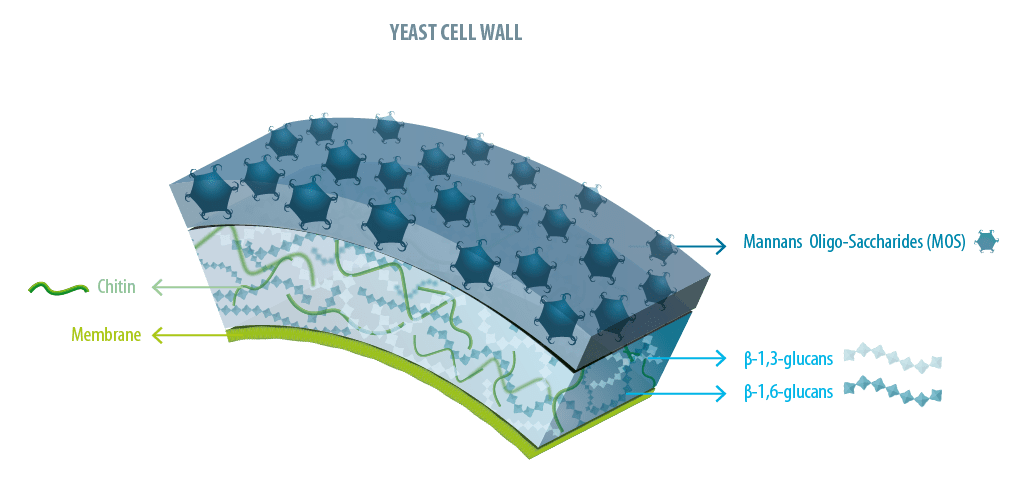 Do you know that there are about 500 different species of yeasts? Saccharomyces cerevisiae is only one of them but by far the most used in food and feed. One of the remarkable elements of S.cerevisiae yeast is the composition and structure of its cell wall. β-glucans and mannans oligo-saccharides (MOS) are the major components of the yeast cell wall. Their ratio and structures change with the yeast strain and growth stage are dependent upon growing conditions, including oxygen and nutrient availability, as well as temperature and pH of the growth medium.