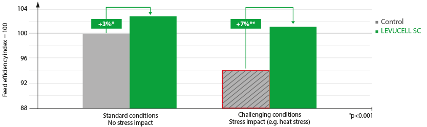 As a result, LEVUCELL SC is able to improve feed efficiency by 3-7% under standard or stressful production conditions (Figure 1). This represents a valuable tool that allows for the forage portion of the diet to be maximized and gives producers and nutritionists the possibility to increase milk or meat revenue per kilogram of feed — or allows them to optimize feed costs while maintaining similar revenue.