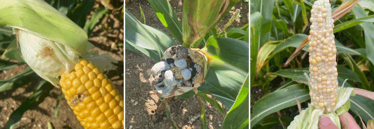 John notes he has seen corn borer, smut, and increased dead material in standing maize crops.